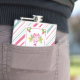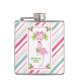 A whimsical tropical christmas flask. A fancy pink flamingo with a leg raised up. Wearing a pink santa hat and some seasonal holly. Holly with berries also decorate the corners. A floral bouquet with candy canes above her head. A pink and green candy cane striped background.