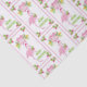 A whimsical tropical christmas pattern on tissue paper. A flamingo with a leg raised up. Wearing a pink santa hat and some seasonal holly. Holly with berries also decorate the corners. A floral bouquet with candy canes above her head. Merry Christmas written in bold green lettering.