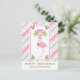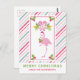 A whimsical and tropical christmas postcard. A pink and green candy cane striped background. Layered over top is a fancy pink flamingo with a leg raised up. Wearing a pink santa hat and some seasonal holly. Holly with berries also decorate the corners. A floral bouquet above her head with candy canes crossed together.