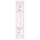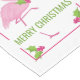 A whimsical tropical christmas table runner. A fancy pink flamingo with a leg raised up. Wearing a pink santa hat and some seasonal holly. Holly with berries also decorate the corners. A floral bouquet with candy canes above her head. A pink and green candy cane striped background.Merry Christmas written in green bold lettering. The center says May your days be Merry and Bright in atrendy script font.