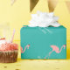 Pink flamingo tropical Christmas wrapping paper with personalized name and seasons greetings. Cute xmas giftwrap design with tropical bird wearing a Santa Claus hat. Funny Holiday wrapping supplies for men women and kids. Merry Christmas! Turquoise blue or custom background color. Available in matte and glossy.