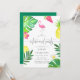 Retirement party invitation with itinerary featuring exotic tropical foliage and flowers, fresh fruits, a flamingo and trendy handwriting typography.
