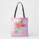 A bright pink flamingo and a tropical hibiscus flower arrangement are set against a fun background of watercolor pink and white stripes. The back of the tote bag features the colorful pink stripes, without the tropical elements. A matching outdoor pillow is also available.