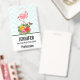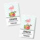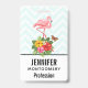 Name badge with a cute digital illustration featuring a pink flamingo with one leg raised. Standing on a bouquet of tropical hibiscus flowers and leaves. A pretty butterfly is hovering around the flowers. A light green and white chevron pattern in the background.