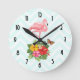 A clock with a cute digital illustration featuring a pink flamingo with one leg raised. Standing on a bouquet of tropical hibiscus flowers and leaves. A pretty butterfly is hovering around the flowers. A light green and white chevron pattern in the background.