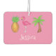 Air freshener features an original illustration of a pineapple, pink flamingo, and tropical palm tree. Simply personalize with your information.