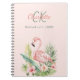 A feminine blush pink background decorated with a pink flamingo and tropical flowers and foliage. Personalize and add a name and your monogram initials.