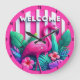 A vibrant wall clock design featuring a pink flamingo amidst tropical plants and flowers, creating an exotic and lively appearance. Bold 'Welcome' text adds a cheerful and inviting touch to the decor.