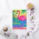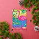 Pink flamingo Tropical standing on one leg, wearing neon sunglasses, with a tropical palm leaf border. Bright pop-art colors (hot pink, lime green, electric blue) and a flat vector style. Cheeky phrase like ‘Tropically Savage’ in bold block letters.