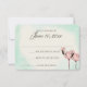 Two hand drawn watercolor pink flamingos decorate this elegant pink wedding response card to compliment invitation with crisp decorative text and warm ivory and mint background.