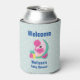 Welcome, personalized event, can cozie. Designed with a cute illustration of a pink flamingo with some watermelons and pineapples. Pink and green color scheme. Summery and tropical. The background is a pale green color with white polka dots.