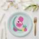 Paper plates with a cute illustration of a pink flamingo with some watermelons and pineapples. Pink and green color scheme. Summery and tropical.