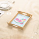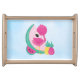 A serving tray with a cute illustration of a pink flamingo with some watermelons and pineapples. Pink and green color scheme. Summery and tropical. The background is a light blue watercolor image.