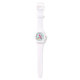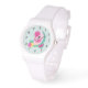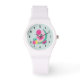 A watch a cute illustration of a pink flamingo with some watermelons and pineapples. Pink and green color scheme. Summery and tropical. The background is a pale green color with white polka dots. Clock face is an art deco style font.