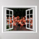 Tropical pink Flamingos, fake window scene, for a windowless office. Very realistic landscape optical illusion poster that would look great on an office or study wall.