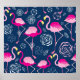 Graphic pink flamingos stand out against a dark blue background.