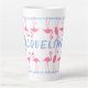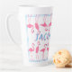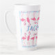 Cute flamingo latte mug with pink and blue design. This fun tropical mug where flamingos surround a central template for a name. Handwritten printed font is in uppercase lettering with a shadow effect. Light blue with pink over a white background, the whole image is bordered in thin blue lines. Choose the smaller mug if you like, but the design will be altered.