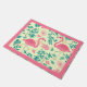 Cute pink flamingo illustration with tropical flowers in pink and blue=green, over light pail yellow background.