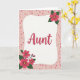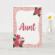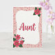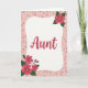 Designed with soft, tender colors, this card features a pastel pink background sprinkled with many tiny, simplified floral shapes that add gentle texture. In the center, an off-white label with smooth inward curves creates a cozy focal area, like a little note held close between loved ones ❤️. The word “Aunt” sits prominently in the middle of that label in bright fuchsia lettering, standing out clearly against the pale center. The overall layout feels affectionate and friendly, like a warm hug expressed through flowers rather than words. In the upper right corner, a single fuchsia blossom opens around a golden-yellow center, surrounded by deep green leaves that frame it like a small bouquet. In the lower left, a fuller cluster of three matching flowers and a small bud leans inward, suggesting a caring, close connection 🌼. The flowers are detailed while the background pattern stays light, with the corner blooms balancing each other across the pink field.