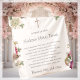 Pretty floral baptism prayer blanket, in elegant, feminine, country style. Featuring a border of watercolour floral roses, anemones and clematis flowers in tones of magenta, pink, purple and cream, surrounding an ornate cross. Set on a clean white background, this design has the beautiful feature of a baptism prayer and the option to add your child's name and baptism date.