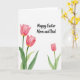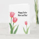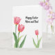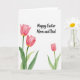 Designed with three soft watercolor-style flowers on a wide white background, this card feels like a quiet spring moment shared between close friends. Two larger pink blossoms rise from the lower left, their slim green stems leaning toward each other as if in a gentle, affectionate nod 🌷. A smaller matching bloom lifts from the lower right, echoing their color and creating a calm, balanced scene. Each petal shifts from deeper rose near the center to a lighter pink at the edges, like a tender blush spreading outward. A small touch of warm yellow sits in the throat of each flower, giving the blooms a subtle glow. The leaves stretch long and narrow in layered greens, adding natural texture without crowding the open space. In the upper-right area, a dark handwritten-style Easter message sits neatly, standing out against the white while leaving plenty of airy room around it 🐰. The final detail is the way the three blossoms form a gentle diagonal line from lower left to upper right, with the smallest flower tucked near the bottom edge.