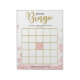 This modern floral "Bridal Bingo" features a pink floral background with golden glitter splashes. The text is written in a mix of a playful calligraphy font and a modern sans font, this bridal bingo card is personalized with the Bride-to-be name and the Bridal Shower date