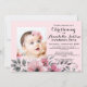 An elegant, pink photo christening invitation you can personalize and send out to your guests for your christening event celebration. All text are set using popular typography. A floral pattern complements the front and back of the invitation on a soft pink background. Enjoy!
