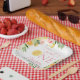 Floral and citrus girl's first birthday part paper plate featuring some lemons, orange, flowers and foliage arrangements and a modern calligraphy heading with a heart.