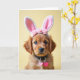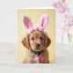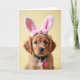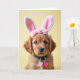 Designed with a youthful dog centered on a soft, sunlit yellow background, this card puts the focus on its sweet face and gentle expression. Reddish-golden fur frames the muzzle and cheeks, catching a diffused glow that makes the coat look extra plush. A festive headband sits across the top of its head with tall bunny ears in pale pink, trimmed with a fuzzy edge, adding a cute 🐰 touch. Three tiny flower accents rest along the band above the forehead, like a small bouquet tucked in place 🌷. The dog’s wide, dark eyes look straight ahead with a tender, friendly gaze that feels like a quiet moment shared with someone close. Around its neck, a slim black collar holds two heart-shaped charms, one in muted rose and one in bright magenta dotted with small white spots. Near the top, a short Easter greeting appears in a simple dark font, centered above the ears. The pink ears rise upright against the yellow field, with the little flowers lined neatly across the brow.