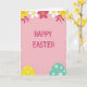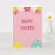 This greeting card features a soft pink background with “HAPPY EASTER” centered in bright fuchsia, giving the message a sweet, friendly spotlight. A thin white outline forms a rectangular border, lightly framing the scene like a gentle hug around the design. Across the top edge, a floral garland stretches from side to side, with blossoms in yellow, white, and fuchsia paired with slim red leaves, suggesting a cheerful springtime gathering 🌷. The flowers sit close together, like companions leaning in for a shared photo, adding a quiet touch of closeness to the layout. In the lower corners, two decorated eggs peek upward as if they’re shyly meeting in the middle, creating a small, affectionate moment 🐰. The left egg is warm yellow with neat white dots, while the right egg is teal with tiny white flower shapes scattered across it. The overall lighting stays soft and even, keeping the colors gentle and easy on the eyes. The fuchsia headline sits above the eggs, while the white border and top garland balance the space with the eggs tucked neatly into both bottom corners.