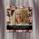 Celebration of life square funeral button featuring a stylish black background, elegant pink watercolor flowers, a photo of your loved one in a faux gold frame, their name, and birth/death dates.