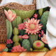 This pillow showcases a lush desert cactus garden with large blooming pink flowers set against green cacti and a dark background. The mix of vibrant florals and natural cactus textures creates a striking design, perfect for adding a touch of southwestern charm and botanical elegance to any living space.