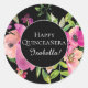 Pink Floral Green Leaves Black Happy Quinceañera Classic Round Sticker