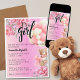 Colorful baby shower invitation for girl baby shower features a beautiful pink background with elegant wallpaper design, pink flowers in the corners and an adorable teddy bear in a basket with balloons of cream and pink simulating a hot air balloon. So cute! Bold font at the top reads "It's a girl" and the rest of the text on the invite is completely editable by you! Makes a great digital invite as well.