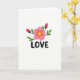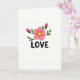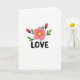 This greeting card features a large five-petal flower in bright pink centered above the word “LOVE.” The flower has a warm orange-and-yellow center, and it looks simple and cheerful, like it’s meant to make someone smile. On each side of the main flower are two smaller pink buds, surrounded by green leaves and thin green stems. The background is plain white, which makes the pink and green colors stand out clearly. The text “LOVE” sits near the bottom in black, hand-drawn block letters that look slightly uneven in a friendly, personal way. Overall, it feels like a sweet mix of romance and everyday affection, perfect for a partner or close friend ❤️💌🍫. Hope it helps you share kind Valentine’s Day feelings with someone you care about.