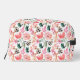 Stylish pink floral pattern cosmetic bag features your monogram initials on the front. Measuring 9.5" x 7" x 5" deep, this bag is made with an all-over print on polyester poplin. Interior zipper pocket is 8" wide and 5" deep, plus two mesh pockets, one zippered, one elastic. Carry handle on the end can also be used to hang the bag. MATCHING items in our collection.