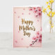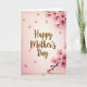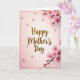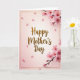 This card features a soft, affectionate Mother’s Day scene with a gentle blush-to-cream background that feels like a warm hug ❤️. Centered on the front is a Mother’s Day message in flowing gold lettering, placed slightly above the midpoint so it catches the eye first. A thin gold rectangular border frames the design, giving the layout a tidy, polished edge without feeling stiff. From the upper right and lower right corners, flowering branches arc inward, their rosy-pink blossoms leaning toward the message like a caring gesture. The blooms show delicate petals and fine stamens, and a few loose petals drift across the open space as if carried by a light spring breeze 🌼. The overall palette stays pastel and airy, with the gold accents adding a touch of glow against the pale center. Small scattered pink petals float diagonally across the background, with the densest cluster near the right side of the card.