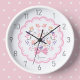 Add a personal touch to your little girl’s space with this charming, personalized wall clock that features a pretty floral bouquet tied with a pink bow, a trendy scalloped edge border, cute bluebirds, and a customizable name. Soft, muted shades of purple, pink, and peach will add a feminine touch to an infant’s nursery or a toddler’s or young girl’s bedroom. Personalize this clock by adding a child’s name. Perfect for new moms, baby showers, or baby gifts.
