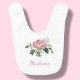 Introducing our cute floral baby bib, perfect for keeping your little one clean and stylish! The bib features a beautiful pink cabbage rose flower design set against a crisp white background, complete with intricate green leaf detailing. To make the bib even more special, we offer an option for personalization, so you can add your baby's name in a chic script font. This bib is a wonderful gift for a new baby, whether for a shower or a sip-and-see party. Keep your baby looking cute and clean with our gorgeous floral baby bib!