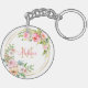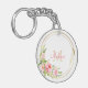 Lovely floral keychain features arrangements of pink and white roses and greenery on a gold foil frame. You personalize it in the center with your name and initial. The reverse side has a similar design and is also monogrammed.