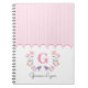 Add a feminine touch to your daily work with this pretty spiral notebook that features delicate pink and peach colored flowers, a pink pinstripe pattern, a trendy scalloped edge border, cute birds, and a customizable monogram. Modify the initial and name to create a one-of-a-kind gift for family, friends, coworkers, or students. Whether you use it to jot down notes, track homework assignments, sketch, or journal, this notebook will make a perfect addition to your workspace or school bag.