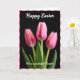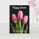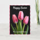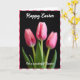 Designed with a tall, vertical layout, this card features a pink-and-white checkered border framing a floral scene. Three spring blossoms in soft blush tones sit against a deep black background, creating a cozy contrast that feels like a quiet, shared moment 🌷. The center flower is sharply detailed with visible veins and gently curved petals, while the two side blooms are slightly out of focus, like companions leaning in close. At the bottom, rich green leaves gather in a small cluster, grounding the arrangement and adding a fresh touch. Soft, diffused lighting makes the petal edges look lightly translucent, with shadows that add depth without feeling harsh. A short message appears near the upper portion in white cursive lettering, standing out clearly against the dark backdrop. The pink checks around the edge repeat evenly on all sides, forming a neat frame around the flowers 🐇.