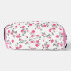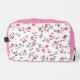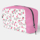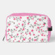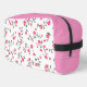 Discover our elegant toiletry bag featuring a charming repeating pattern of delicate pink flowers and vine-like stems with gray-green leaves on a crisp white background. Perfect for organizing your essentials, this stylish accessory showcases simple, rounded floral designs with subtle pink highlights, complemented by slender, slightly stylized stems and leaves. Add a touch of floral sophistication to your travel routine with this visually pleasing, flower-inspired storage solution.