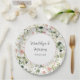 Surrounding a central round frame, there are soft pink flowers accented by green leaves and small white blossoms. The arrangement is symmetrical, creating a harmonious appearance. The white background amplifies the beauty of the floral details, making the design charming and refined.