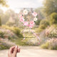 A clear, transparent background, decorated with watercolored pink and white flowers in a wreath, a pink bow and a golden cross. Personalize and add a name and details.