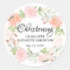 Soft pink watercolor roses form a beautiful wreath. Christening is written in a flowing script. Her name is written below with the date.