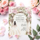 A large marble arch decorated with pink florals. A girl with a white dress.