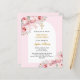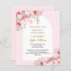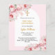 A white arch frame and light pint background. Decorated with pink flowers and pin bows. A golden cross. Personalize and add a name and details.