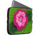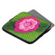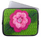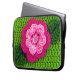 Green and pink floral image printed on electronics bag is from a photo of an original crocheted creation designed handmade and Copyright © by published designer Delores Chamblin. The picture of the unique handcrafted flower and leaves with visible stitches and pearly button is reproduced on the travel case.