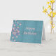 Cute pink and purple flowers with a gold fleck on a blue background which has a recycled paper look. This pretty greeting card is easy to customise for any occasion. The inside is blank for your own personal message.